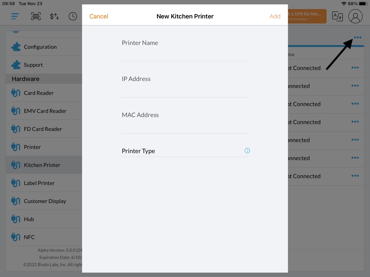 5. To add a new printer, click on options (three dots) and fill in necessary details (i.e. Printer Name, IP address, MAC Address and Printer Type).