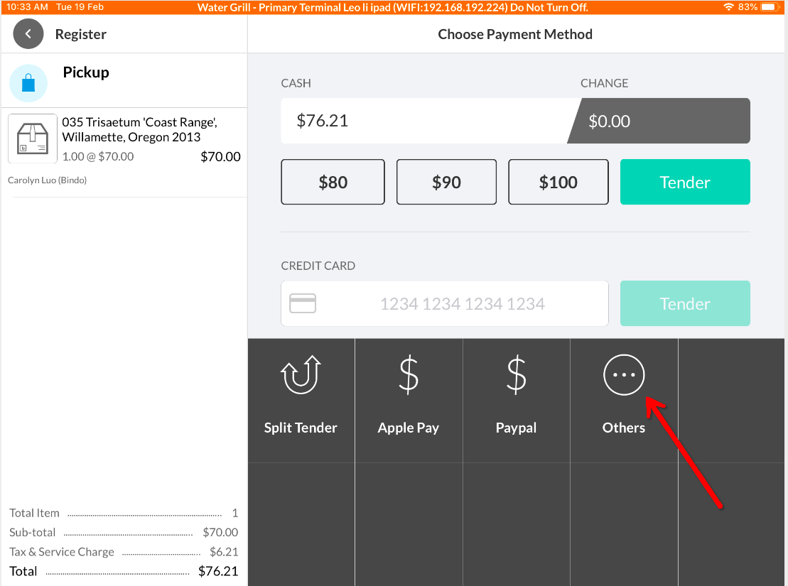 After you tap on "Others", payment types will show as in the image below. Tap on the payment type that you want to use for this sale.